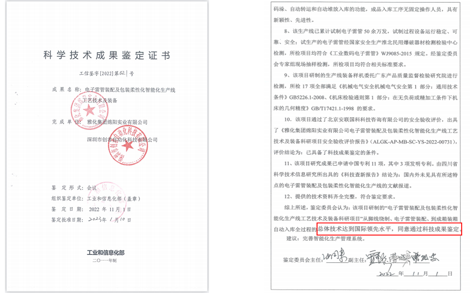 On November 1, 2022, the Department of Work Safety under the Ministry of Industry and Information Technology organized a scientific achievement appraisal meeting at Mianyang Industrial Co., Ltd. of Yaxing Group (hereinafter referred to as "Yahua Mianyang"). Chaired by Second-Level Inspector Xiao Yuehua, a seven-member expert committee evaluated the "Flexible & Intelligent Electronic Detonator Assembly and Packaging Production Line Technology & Equipment" R&D project jointly developed by Yahua Mianyang and Shenzhen Chuangzhe Automation Technology Co., Ltd. (hereinafter referred to as "Shenzhen Chuangzhe").